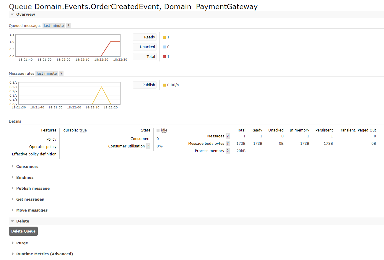 Veja neste print o que acontece quando o serviço Pagamento não está disponivel. A fila guarda a mensagem para ser processada. Assim que aplicação subir o pagamento será processado: