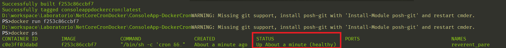 Se as execuções da Console App estão com sucesso, então o (healthy) irá aparecer na frente do STATUS.